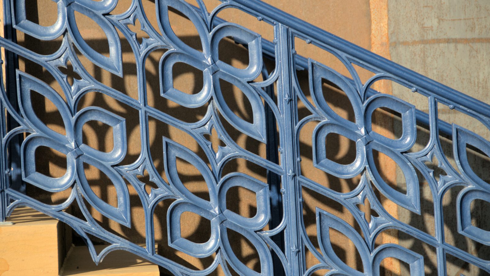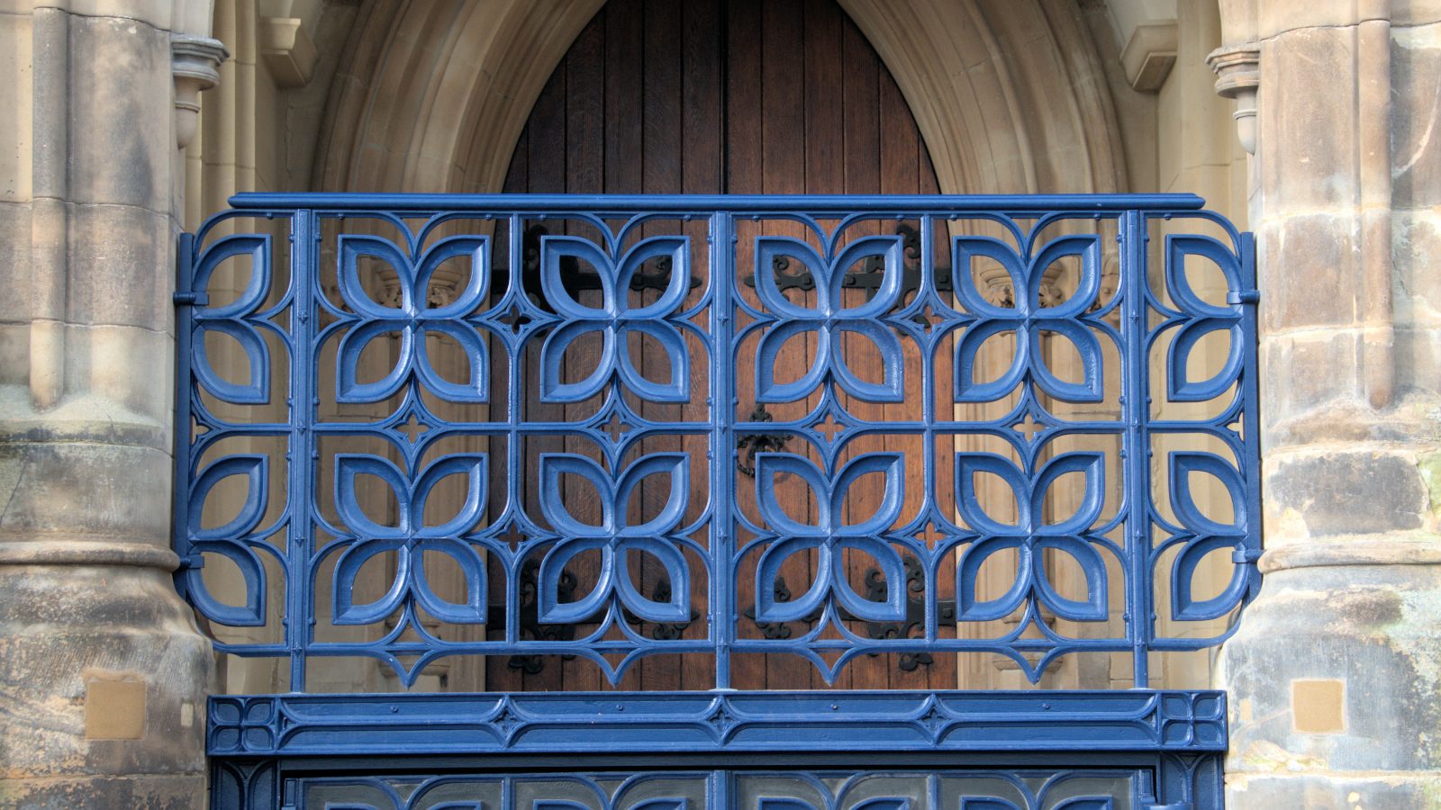 It is easy to fall into the trap of assuming that all ironwork should be painted black. In fact black was seldom chosen prior to the nineteen twenties, and so would not have been appropriate to a building of this period. The architect was keen that the colour of the ironwork should reflect the symbolism of the Catholic faith, and blue was chosen as it represents the sacred virgin, and was a colour extensively used elsewhere by the Pugins, father and son.